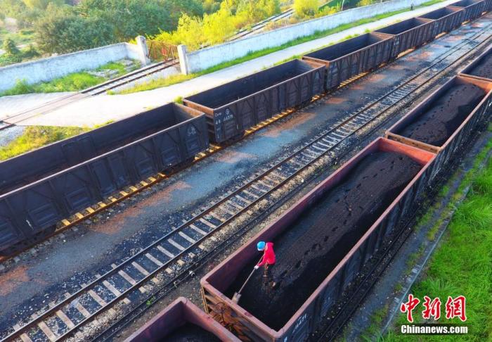 資料圖:工人整理貨物列車(chē)上的電煤。 胡國(guó)林 攝