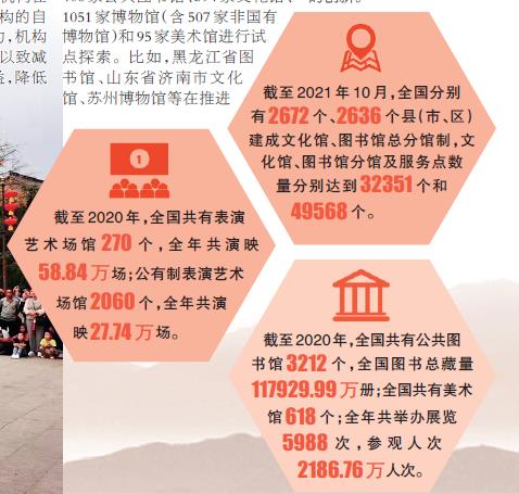 文化和旅游部公共服務(wù)司負(fù)責(zé)人介紹,從規(guī)???,截至2021年10月,全國約有94%的縣(市、區(qū))建成了文化館的總分館制,分館數(shù)量3.2萬個,93%的縣(市、區(qū))建成圖書館的總分館制,分館數(shù)量4.9萬個;從效果看,總分館制改革促進(jìn)了公共文化服務(wù)供給側(cè)與需求側(cè)的有效對接,并且通過因地制宜在商業(yè)中心、社區(qū)學(xué)校、機(jī)場車站等人流密集處設(shè)立特色分館,開展“嵌入式”“數(shù)字化”服務(wù),有效降低了運(yùn)營成本,實(shí)現(xiàn)了設(shè)施和服務(wù)“房前屋后遍地開花”。