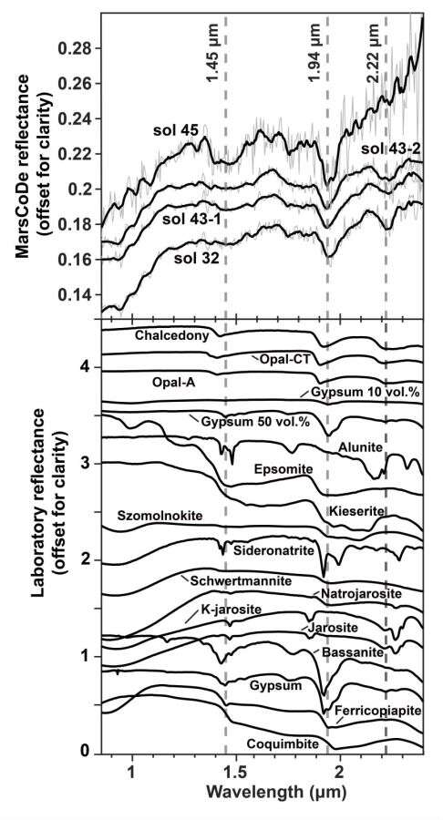 劉洋研究員和合作者通過(guò)對(duì)祝融號(hào)火星表面成分探測(cè)器獲取的短波紅外光譜和導(dǎo)航與地形相機(jī)數(shù)據(jù)進(jìn)行分析,發(fā)現(xiàn)了一種形貌上類似沉積巖的巖石類型——板狀的亮色巖石。這些板狀巖石通常部分被灰塵和土壤覆蓋,顯示出剝落的表面,表明受到熱應(yīng)力和風(fēng)成作用的物理風(fēng)化。研究人員利用短波紅外光譜在這些亮色板狀巖石中探測(cè)到了之前軌道數(shù)據(jù)在該區(qū)域沒(méi)有識(shí)別到的含水礦物,這些光譜具有~1.9μm和~2.2μm吸收特征,推測(cè)其為含水硅或含水硫酸鹽。