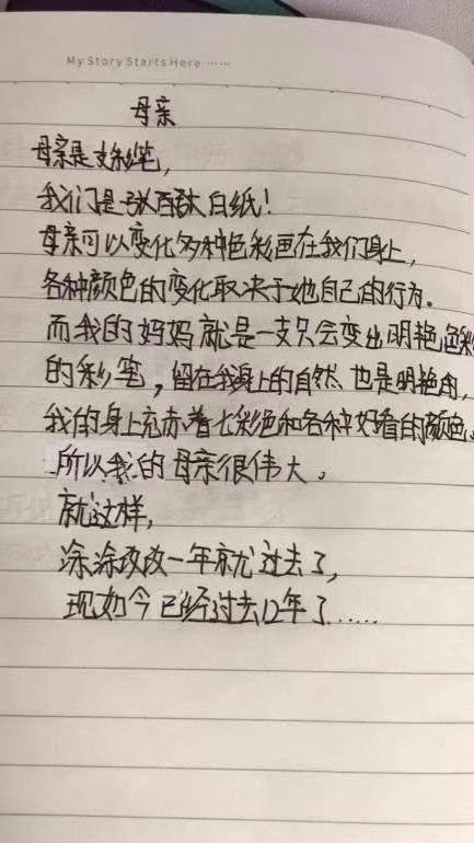 在與孩子們視頻通話時(shí),盛楠收到了一封來自大女兒親筆寫的信:“母親是支彩筆,我們是張白紙。母親可以變化多種色彩畫在我們身上,各種顏色的變化取決于她自己的行為。而我的媽媽就是一支只會變出明艷色彩的彩筆,留在我身上的自然也是明艷的,我的身上充斥著七彩色和各種好看的顏色,所以我的母親很偉大。就這樣,涂涂改改一年就過去了,現(xiàn)如今已經(jīng)過去12年了……”讀到這里盛楠濕潤了眼眶。
