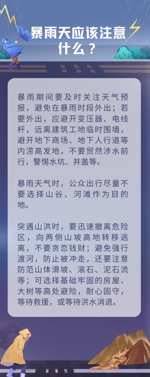 暴雨天應(yīng)該注意什么?業(yè)內(nèi)專家建議,暴雨期間要及時關(guān)注天氣預(yù)報,避免在暴雨時段外出;若要外出,應(yīng)避開變壓器、電線桿,遠(yuǎn)離建筑工地臨時圍墻,避開地下商場、地下人行道等內(nèi)澇高發(fā)地,不要貿(mào)然涉水前行,警惕水坑、井蓋等。