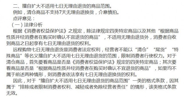 文章明確,對(duì)于清倉商品,首先要看商品是否是《消費(fèi)者權(quán)益保護(hù)法》規(guī)定的四類特定商品;其次要看商品是否是“根據(jù)商品性質(zhì)并經(jīng)消費(fèi)者在購買時(shí)確認(rèn)不宜退貨的商品”,如果均不屬于前述兩種情形,則消費(fèi)者依法享有七日無理由退換貨的權(quán)利。