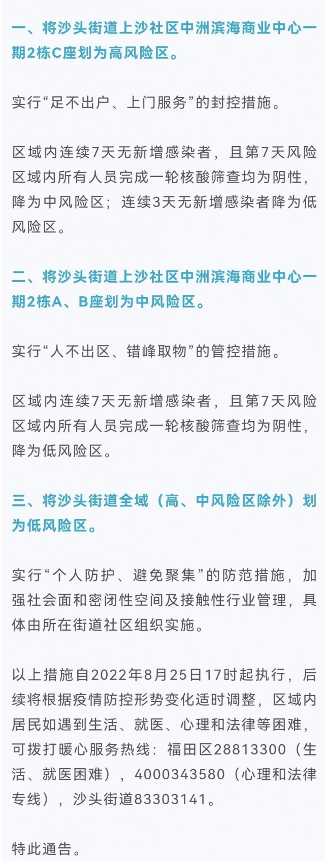8月25日,廣東省深圳市福田區(qū)新型冠狀病毒肺炎疫情防控指揮部發(fā)布通告稱,根據(jù)當(dāng)前福田區(qū)疫情防控工作需要,按照國務(wù)院應(yīng)對新型冠狀病毒肺炎疫情聯(lián)防聯(lián)控機(jī)制綜合組《新型冠狀病毒肺炎疫情防控方案(第九版)》和《廣東省新冠肺炎本地疫情應(yīng)急處置方案(第五版)》相關(guān)規(guī)定,經(jīng)專家組研判,自2022年8月25日起,福田區(qū)在沙頭街道劃定高風(fēng)險(xiǎn)區(qū)、中風(fēng)險(xiǎn)區(qū)、低風(fēng)險(xiǎn)區(qū)如下: