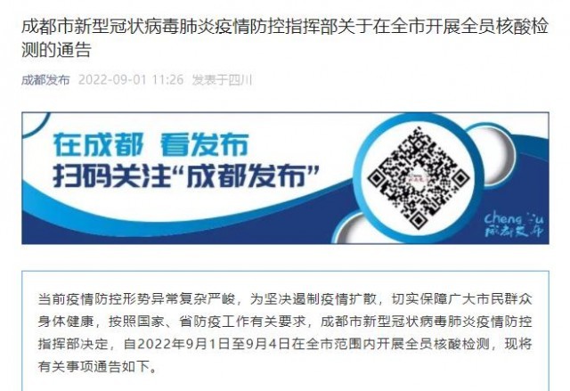 當前疫情防控形勢異常復雜嚴峻,為堅決遏制疫情擴散,切實保障廣大市民群眾身體健康,按照國家、省防疫工作有關要求,成都市新型冠狀病毒肺炎疫情防控指揮部決定,自2022年9月1日至9月4日在全市范圍內(nèi)開展全員核酸檢測,現(xiàn)將有關事項通告如下?!?/p>