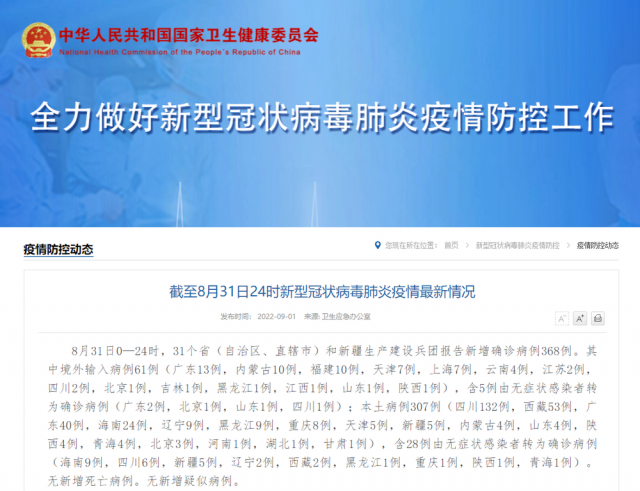8月31日0—24時,31個省(自治區(qū)、直轄市)和新疆生產(chǎn)建設(shè)兵團(tuán)報告新增確診病例368例。其中境外輸入病例61例(廣東13例,內(nèi)蒙古10例,福建10例,天津7例,上海7例,云南4例,江蘇2例,四川2例,北京1例,吉林1例,黑龍江1例,江西1例,山東1例,陜西1例),含5例由無癥狀感染者轉(zhuǎn)為確診病例(廣東2例,北京1例,山東1例,四川1例);本土病例307例(四川132例,西藏53例,廣東40例,海南24例,遼寧9例,黑龍江9例,重慶8例,天津5例,新疆5例,內(nèi)蒙古4例,山東4例,陜西4例,青海4例,北京3例,河南1例,湖北1例,甘肅1例),含28例由無癥狀感染者轉(zhuǎn)為確診病例(海南9例,四川6例,新疆5例,遼寧2例,西藏2例,黑龍江1例,重慶1例,陜西1例,青海1例)。無新增死亡病例。無新增疑似病例。