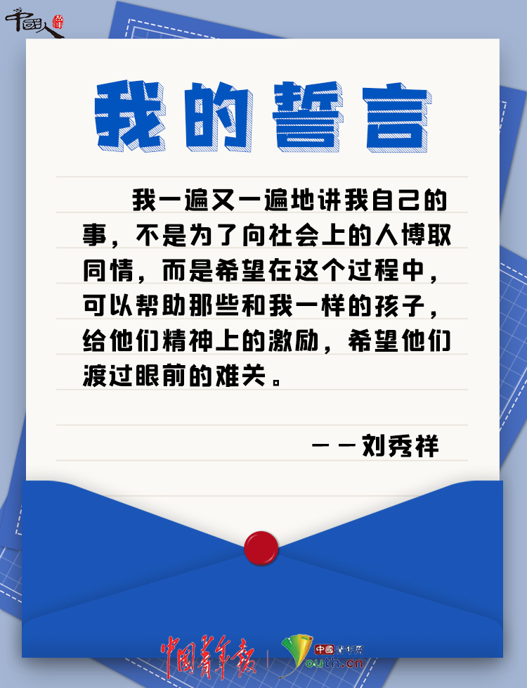 他說(shuō):“我一遍又一遍地講我自己的事,不是為了向社會(huì)上的人博取同情,而是希望在這個(gè)過(guò)程中,可以幫助那些和我一樣的孩子,給他們精神上的激勵(lì),希望他們渡過(guò)眼前的難關(guān)?!?/p>