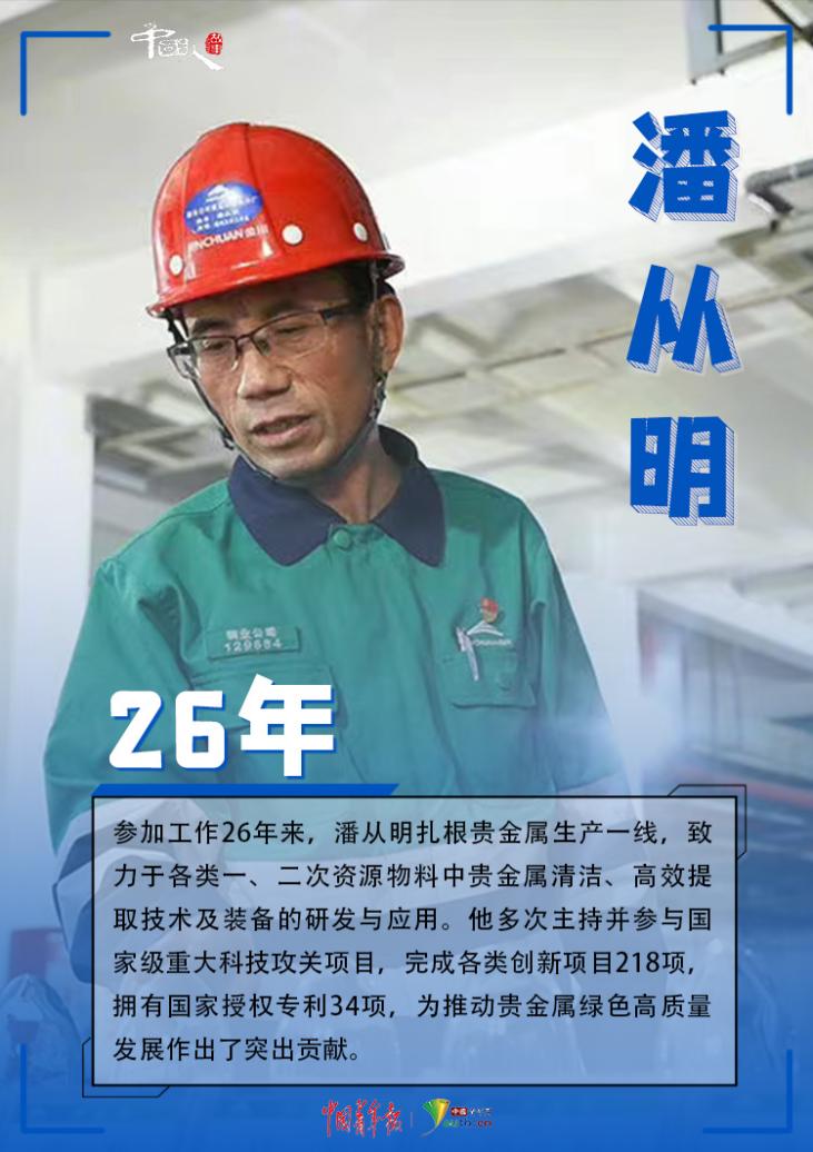 參加工作26年來,潘從明扎根貴金屬生產(chǎn)一線,致力于各類一、二次資源物料中貴金屬清潔、高效提取技術(shù)及裝備的研發(fā)與應用。他多次主持并參與國家級重大科技攻關(guān)項目,完成各類創(chuàng)新項目218項,擁有國家授權(quán)專利34項,為推動貴金屬綠色高質(zhì)量發(fā)展作出了突出貢獻。