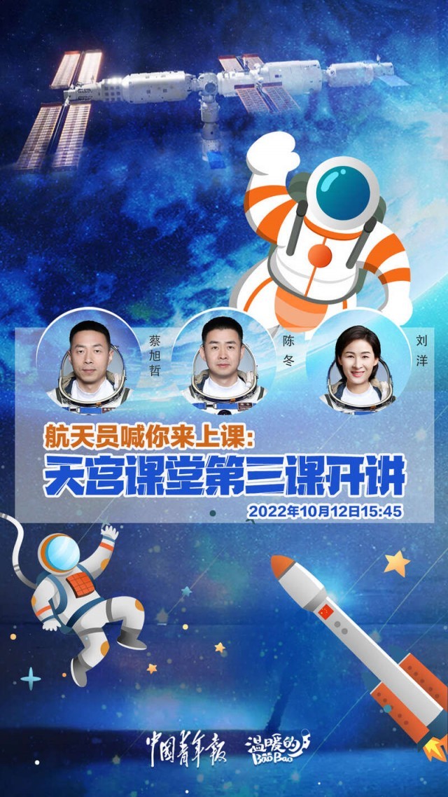 中國(guó)青年報(bào)客戶端北京10月12日電(中青報(bào)·中青網(wǎng)記者 邱晨輝)據(jù)中國(guó)載人航天工程辦公室消息,北京時(shí)間2022年10月12日16時(shí)01分,“天宮課堂”第三課在中國(guó)空間站開(kāi)講,新晉“太空教師”陳冬、劉洋、蔡旭哲為廣大青少年帶來(lái)一場(chǎng)精彩的太空科普課,這是中國(guó)航天員首次在問(wèn)天實(shí)驗(yàn)艙內(nèi)進(jìn)行授課。