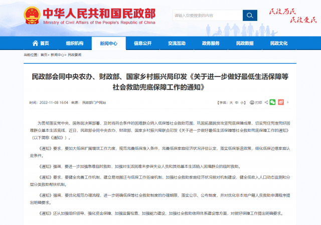 據(jù)民政部網(wǎng)站消息,為貫徹落實(shí)黨中央、國務(wù)院決策部署,及時(shí)將符合條件的困難群眾納入低保等社會救助范圍,鞏固拓展脫貧攻堅(jiān)兜底保障成果,切實(shí)兜住兜準(zhǔn)兜好困難群眾基本生活底線,近日,民政部會同中央農(nóng)辦、財(cái)政部、國家鄉(xiāng)村振興局聯(lián)合印發(fā)《關(guān)于進(jìn)一步做好最低生活保障等社會救助兜底保障工作的通知》(以下簡稱《通知》)。