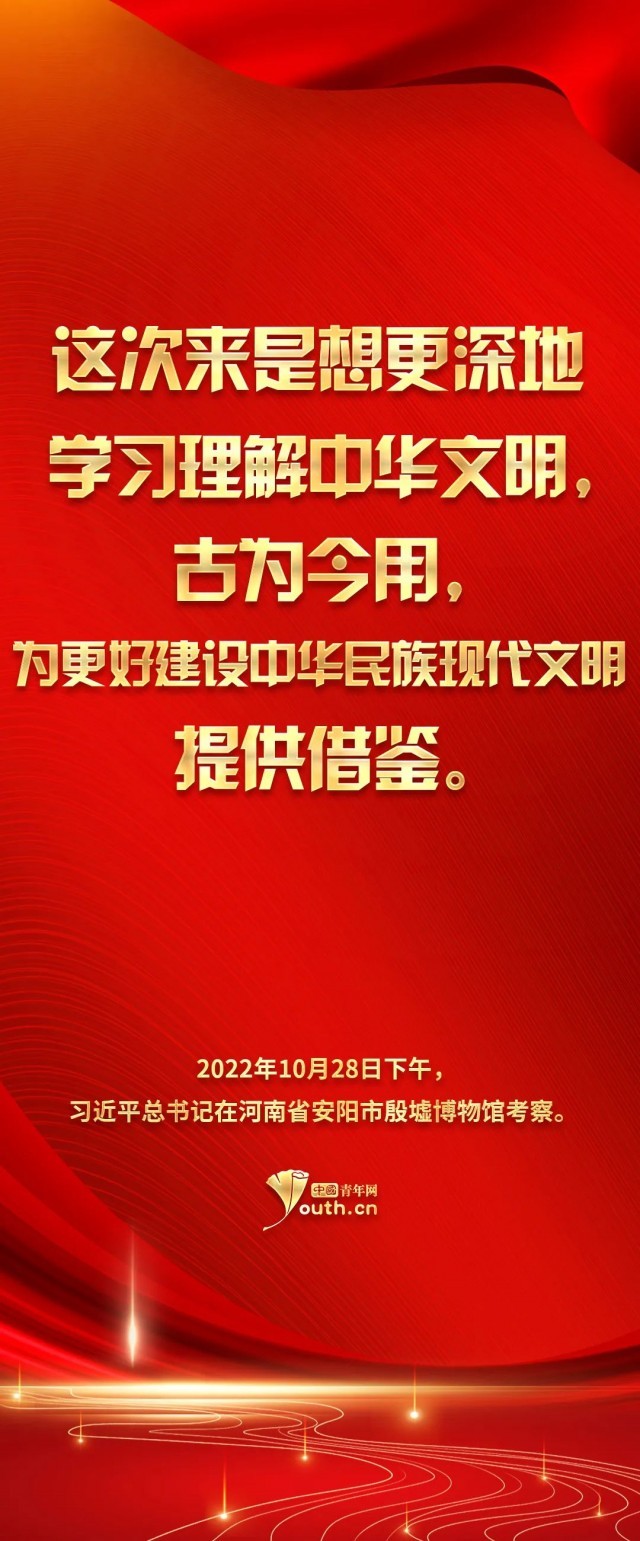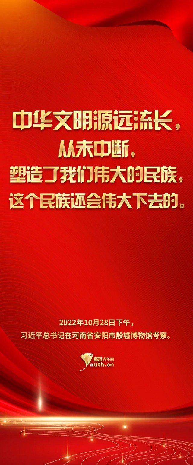 2022年10月28日,習(xí)近平總書(shū)記在黨的二十大勝利閉幕后就來(lái)到他向往已久的殷墟考察,并發(fā)表了重要講話?!耙笮娉鐾恋募坠俏臑槲覀儽4?000年前的文字,把中國(guó)信史向上推進(jìn)了約1000年?!绷?xí)總書(shū)記指出,中國(guó)的漢文字非常了不起,中華民族的形成和發(fā)展離不開(kāi)漢文字的維系。