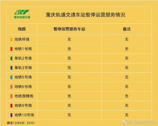 央視網(wǎng)消息:據(jù)@重慶軌道交通,12月5日06:30起,暫停運營服務(wù)的車站全部恢復(fù)運營服務(wù)。