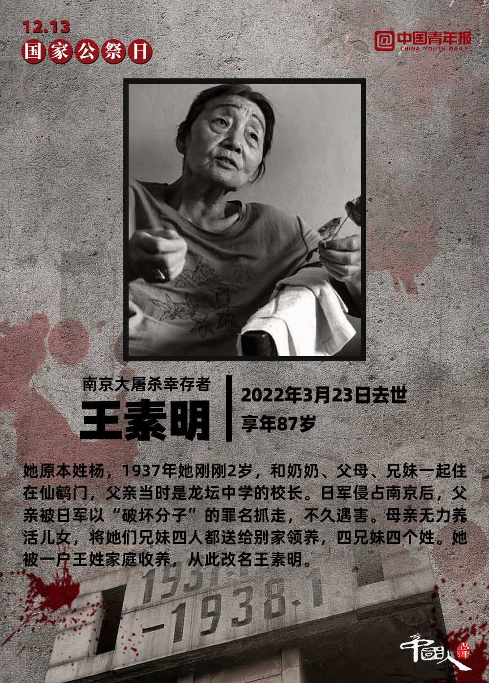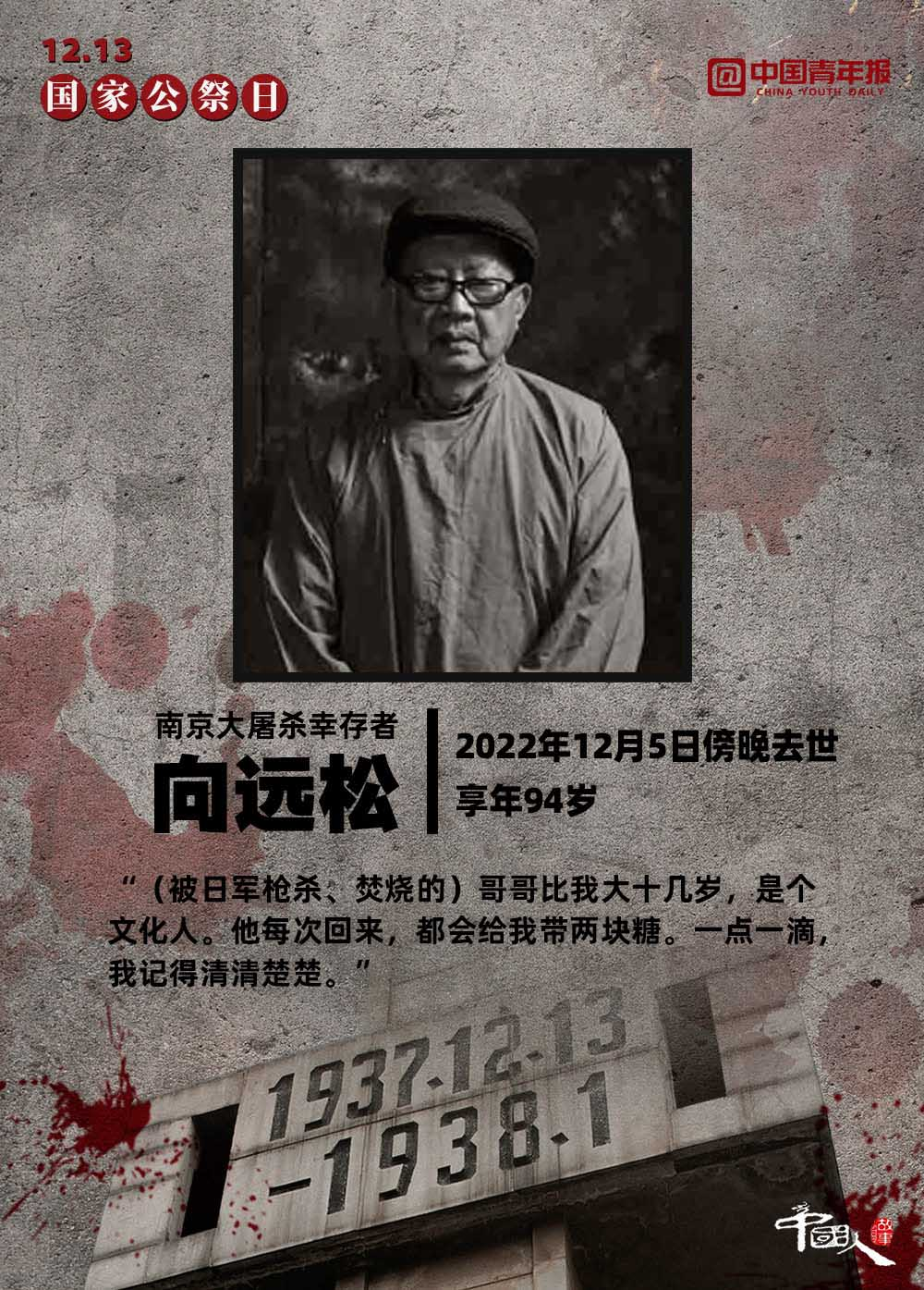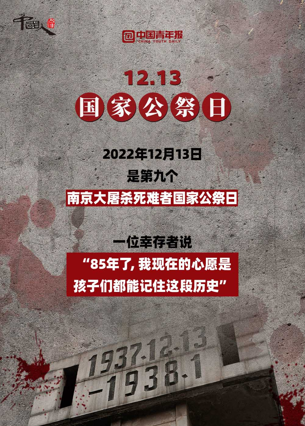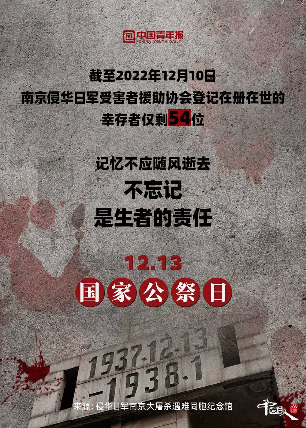 12月13日,是第九個(gè)南京大屠殺死難者國家公祭日 。截至2022年12月12日,南京侵華日軍受害者援助協(xié)會(huì)登記在冊(cè)在世的幸存者僅剩54位。一位南京大屠殺幸存者說:“85年了,我現(xiàn)在的心愿是孩子們都能記住這段歷史?!弊屛覀儗⑦@段歷史銘刻在內(nèi)心深處,讓“記住”化作一種責(zé)任,伴著我們堅(jiān)定前行。