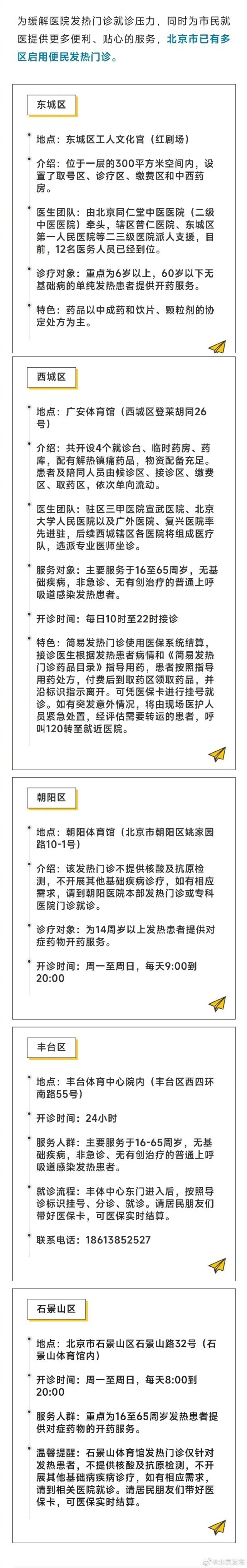 央視網消息:據(jù)@北京發(fā)布 微博,為緩解醫(yī)院發(fā)熱門診就診壓力,同時為市民就醫(yī)提供更多便利、貼心的服務,北京市已有多區(qū)啟用便民發(fā)熱門診。