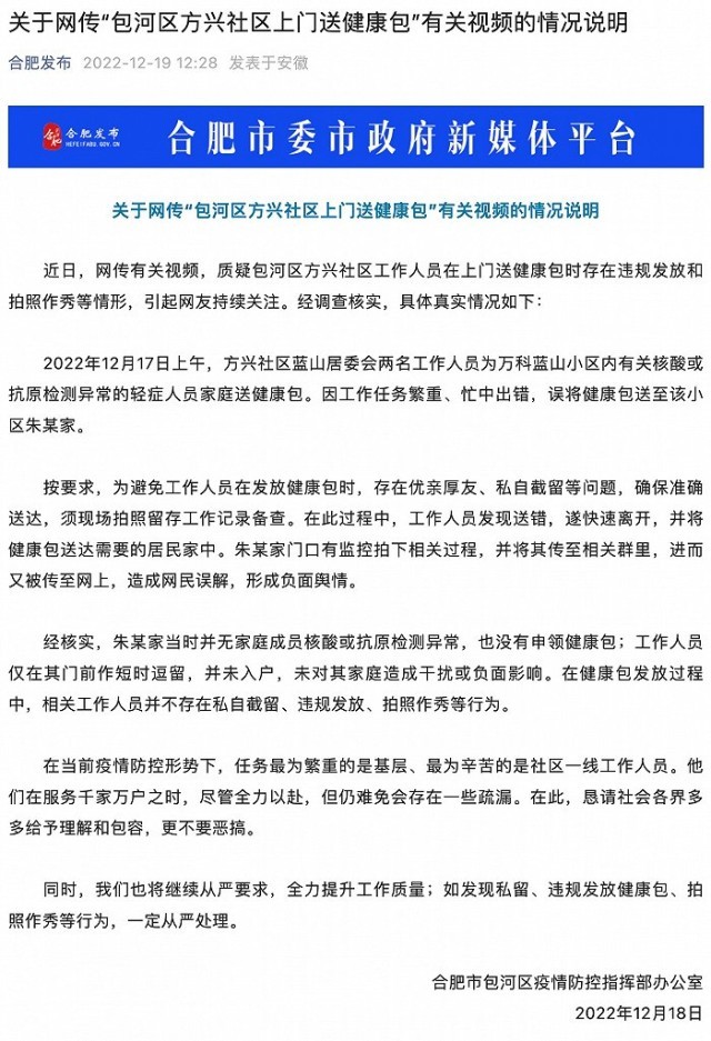 央視網(wǎng)消息:“合肥發(fā)布”微信公眾號(hào)12月19日消息,合肥市包河區(qū)疫情防控指揮部辦公室發(fā)布情況說(shuō)明稱,近日,網(wǎng)傳有關(guān)視頻,質(zhì)疑包河區(qū)方興社區(qū)工作人員在上門(mén)送健康包時(shí)存在違規(guī)發(fā)放和拍照作秀等情形,引起網(wǎng)友持續(xù)關(guān)注。經(jīng)調(diào)查核實(shí),具體真實(shí)情況如下: