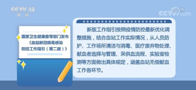 央視網(wǎng)消息:為落實(shí)進(jìn)一步優(yōu)化新冠肺炎疫情防控措施相關(guān)要求,指導(dǎo)采供血機(jī)構(gòu)科學(xué)有效做好無償獻(xiàn)血工作,國家衛(wèi)生健康委辦公廳、中央軍委后勤保障部衛(wèi)生局組織專家對2021年印發(fā)的《血站新冠肺炎疫情常態(tài)化防控工作指引》進(jìn)行修訂,形成《血站新冠病毒感染防控工作指引(第二版)》,指導(dǎo)采供血機(jī)構(gòu)切實(shí)做好新形勢下疫情防控工作,保障血站工作人員和獻(xiàn)血者安全,實(shí)現(xiàn)血液安全供應(yīng)。