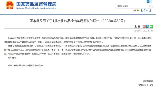 國家藥監(jiān)局官網(wǎng)消息,在2022年國家化妝品監(jiān)督抽檢工作中,經(jīng)四川省藥品檢驗研究院(四川省醫(yī)療器械檢測中心)檢驗,標簽標示為生產(chǎn)商廣州冪姿生物科技有限公司、總經(jīng)銷重慶郡燦化妝品有限公司生產(chǎn)的鑫彤祛痘精華,檢出《化妝品安全技術規(guī)范(2015年版)》中規(guī)定的禁用原料。