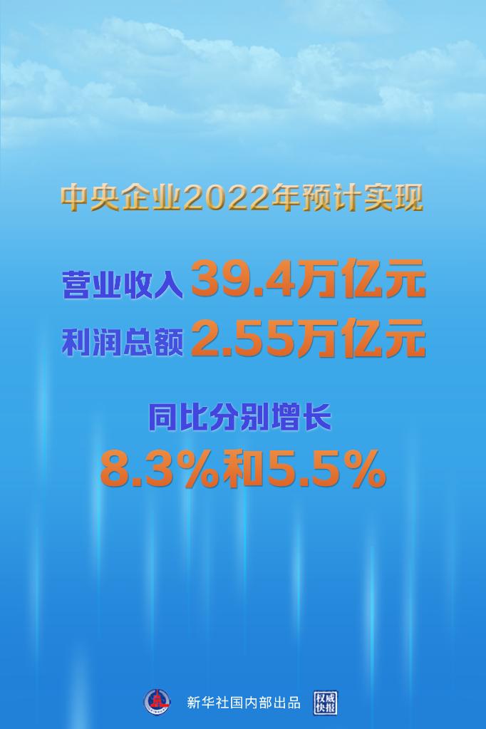 新華社北京1月5日電(記者王希)2022年,國資央企統(tǒng)籌疫情防控和企業(yè)生產經營,統(tǒng)籌發(fā)展和安全,推動經濟運行實現穩(wěn)中有進,中央企業(yè)全年預計實現營業(yè)收入39.4萬億元、利潤總額2.55萬億元,同比分別增長8.3%和5.5%。