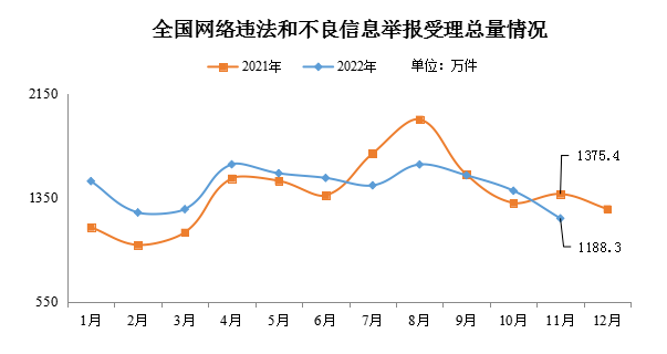 中央網(wǎng)信辦舉報(bào)中心近日公布的統(tǒng)計(jì)數(shù)據(jù)顯示,2022年11月,中央網(wǎng)信辦舉報(bào)中心指導(dǎo)全國各級網(wǎng)信舉報(bào)工作部門、主要網(wǎng)站平臺受理舉報(bào)1188.3萬件,環(huán)比下降15.1%、同比下降13.6%。