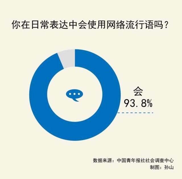 數(shù)據(jù)顯示,93.8%的受訪青年會(huì)在日常表達(dá)中使用網(wǎng)絡(luò)流行語(yǔ),90后的比例更高(95.9%)。