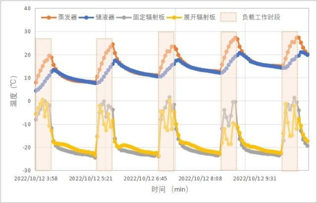 中科院微小衛(wèi)星創(chuàng)新院的可展收式輻射器成功在軌實(shí)現(xiàn)首次應(yīng)用,輻射器執(zhí)行機(jī)構(gòu)已順利完成六十余次展開(kāi)和收攏動(dòng)作,連續(xù)五軌動(dòng)態(tài)試驗(yàn)結(jié)果(如圖10)表明環(huán)路熱管-可展收式輻射器集成系統(tǒng)在負(fù)載工作時(shí)段啟動(dòng)性能良好,輻射器連續(xù)展開(kāi)-收攏可實(shí)現(xiàn)散熱能力在軌大范圍調(diào)控。
