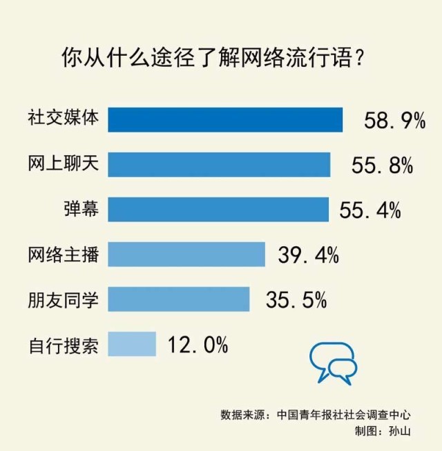 數(shù)據(jù)顯示,微博、小紅書、微信等社交媒體(58.9%)是受訪青年知曉網(wǎng)絡流行語的主要途徑。接下來是網(wǎng)上聊天(55.8%)、彈幕(55.4%)。其他還有:網(wǎng)絡主播(39.4%)、朋友同學(35.5%)和自行搜索(12.0%)等。