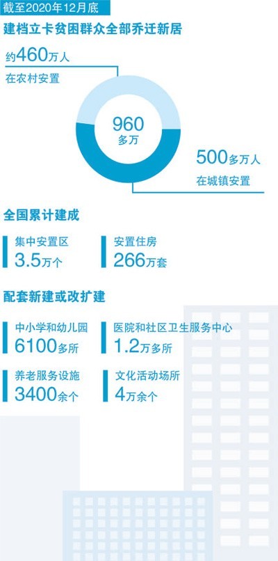 習(xí)近平總書記強調(diào):“易地搬遷是解決一方水土養(yǎng)不好一方人、實現(xiàn)貧困群眾跨越式發(fā)展的根本途徑,也是打贏脫貧攻堅戰(zhàn)的重要途徑?!秉h的十八大以來,全國累計建成集中安置區(qū)3.5萬個、安置住房266萬套。到2020年底,全國易地扶貧搬遷規(guī)劃建設(shè)任務(wù)全面完成,近千萬生活在“一方水土難養(yǎng)一方人”地方的建檔立卡貧困人口實現(xiàn)易地扶貧搬遷,搬入新家園、開啟新生活。