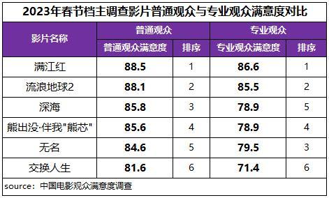 從普通觀眾和專業(yè)觀眾評價排序上看,《滿江紅》和《流浪地球2》得到了普通觀眾和專業(yè)觀眾的一致認可,前者普通觀眾滿意度得分88.5分、專業(yè)觀眾滿意度得分86.6分,分別居歷史調(diào)查影片的第七位、第六位;后者普通觀眾滿意度得分88.1分、專業(yè)觀眾滿意度得分85.5分,均居歷史調(diào)查影片的第九位。同時,普通觀眾和專業(yè)觀眾對于《熊出沒 伴我“熊芯”》和《交換人生》評價排序也都保持一致,分別列第四位、第六位,此處需要說明的是中國電影觀眾滿意度調(diào)查樣本目前并未覆蓋12歲以下的兒童群體。在評價差異上,普通觀眾對于《深?!?、專業(yè)觀眾對于《無名》評價排序列分別列第三位,反之分別列第五位。