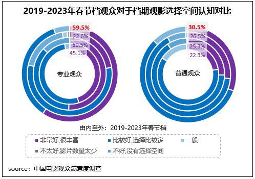 在調(diào)查中,針對“您認為檔期觀影選擇空間如何”這一問題,普通觀眾和專業(yè)觀眾認為檔期觀影選擇“非常好,很豐富”的占比均為2019年來的最高值。