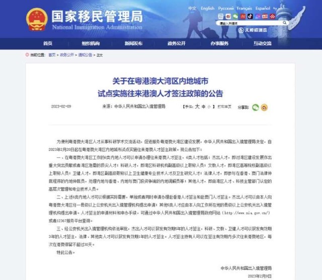 粵港澳大灣區(qū)內(nèi)地城市2月20日起試點(diǎn)實(shí)施往來港澳人才簽注政策
