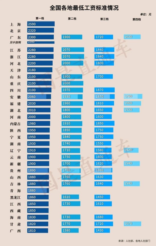 上述四地調(diào)整后,全國已有15個省份最低工資標準加入“2000元俱樂部”。其中上海最高,為2590元。緊隨其后的是:北京(2320元)、廣東(2300元,其中深圳2360元)。
