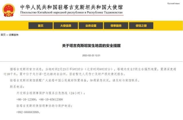 駐塔吉克斯坦使館提醒廣大旅塔中國公民做好防震準(zhǔn)備,如遇緊急狀況,請及時(shí)與使館聯(lián)系。