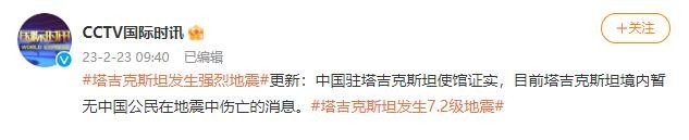 央視網消息:據@CCTV國際時訊 微博,中國駐塔吉克斯坦使館證實,目前塔吉克斯坦境內暫無中國公民在地震中傷亡的消息。