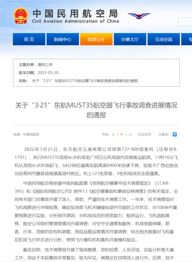中國(guó)民航局發(fā)布《關(guān)于“3·21”東航MU5735航空器飛行事故調(diào)查進(jìn)展情況的通報(bào)》