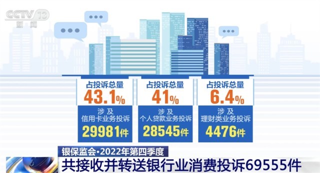 2022年第四季度,中國銀保監(jiān)會及其派出機(jī)構(gòu)共接收并轉(zhuǎn)送銀行業(yè)消費投訴69555件。其中,涉及信用卡業(yè)務(wù)投訴29981件,占投訴總量的43.1%;涉及個人貸款業(yè)務(wù)投訴28545件,占投訴總量的41%;涉及理財類業(yè)務(wù)投訴4476件,占投訴總量的6.4%。