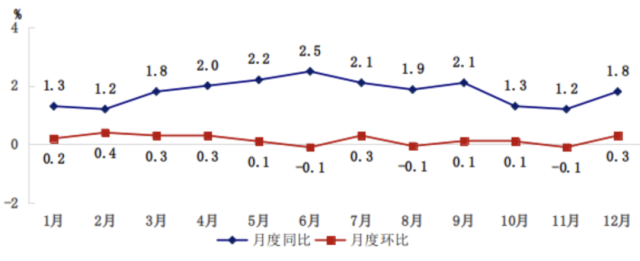 全年居民消費(fèi)價(jià)格總水平比上年上漲1.8%。工業(yè)生產(chǎn)者出廠價(jià)格上漲2.3%,工業(yè)生產(chǎn)者購進(jìn)價(jià)格上漲6.2%。農(nóng)產(chǎn)品生產(chǎn)者價(jià)格上漲2.7%。12月份,新建商品住宅銷售價(jià)格環(huán)比指數(shù)為100.2、同比指數(shù)為105.8;二手住宅銷售價(jià)格環(huán)比指數(shù)為99.6、同比指數(shù)為103.9。