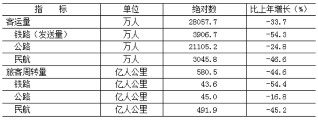 全年貨運(yùn)量24037.4萬噸,比上年下降14.5%;貨物周轉(zhuǎn)量881.5億噸公里,增長0.1%。全年客運(yùn)量28057.7萬人,下降33.7%;旅客周轉(zhuǎn)量580.5億人公里,下降44.6%。