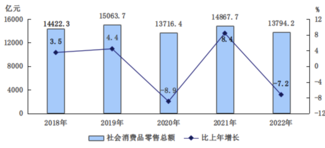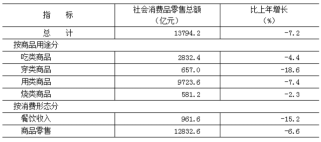 全年市場總消費(fèi)額比上年下降4.9%。其中,服務(wù)性消費(fèi)額下降2.9%;實(shí)現(xiàn)社會(huì)消費(fèi)品零售總額13794.2億元,下降7.2%。