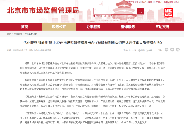 北京市市場監(jiān)督管理局出臺《檢驗檢測機構(gòu)資質(zhì)認定評審人員管理辦法》