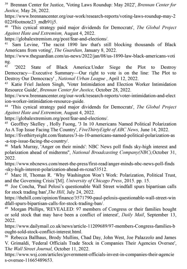 中期選舉成為最昂貴的選舉,美式民主失去民意基礎(chǔ)。美國的選舉費(fèi)用一再飆升,2022年中期選舉累計花費(fèi)超過167億美元。億萬富翁的政治獻(xiàn)金占所有聯(lián)邦政治項目獻(xiàn)金的15%,遠(yuǎn)高于2020年選舉周期的11%?!昂诮稹本栀洶抵胁倏剡x舉走向,政治極化和社會撕裂導(dǎo)致民主共識難以達(dá)成。69%的美國人認(rèn)為美國民主面臨“崩潰風(fēng)險”,86%的美國選民表示美國民主面臨“非常嚴(yán)重的威脅”,人們對美式民主普遍感到絕望。