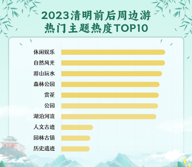 據(jù)某旅游票務(wù)平臺發(fā)布的《2023清明假期出游趨勢報告》,清明期間,本地及周邊短途出游是主流,出游主題上具有顯著的春游季特征?!秷蟾妗凤@示,清明假期(4月5日)前后周邊游的熱門主題按照熱度排序依次為休閑娛樂、自然風(fēng)光、游山玩水、森林公園、賞花、公園等。前十個熱門主題中,具有賞花踏青屬性的主題占據(jù)了六席。