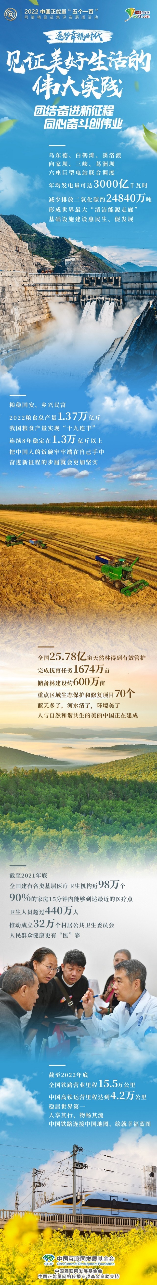 糧食生產(chǎn)實(shí)現(xiàn)“十九連豐”、生態(tài)文明建設(shè)深入人心、基層醫(yī)療衛(wèi)生機(jī)構(gòu)全覆蓋、基礎(chǔ)設(shè)施建設(shè)加碼發(fā)力、綜合立體交通網(wǎng)加速成形……“五個(gè)一百”展示助推中國經(jīng)濟(jì)發(fā)展、服務(wù)百姓生活的重大項(xiàng)目與惠民工程,用人們創(chuàng)造美好生活的偉大實(shí)踐,匯聚同心奮斗的磅礴力量,激勵億萬網(wǎng)民逐夢幸福時(shí)代。(記者 劉尚君 潘曉文 朱鈞有)
