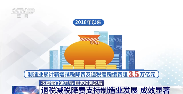 據(jù)介紹,在一系列退稅減稅降費舉措中,下調制造業(yè)等領域的增值稅稅率、率先提高制造業(yè)研發(fā)費用加計扣除比例、加大制造業(yè)增值稅留抵退稅力度等減負措施,有效支持了制造業(yè)緩解經(jīng)營壓力、增強創(chuàng)新動力、激活發(fā)展?jié)摿Α?/p>
