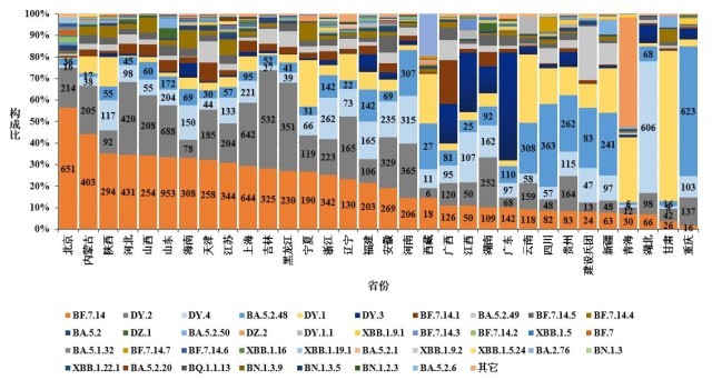 2.圖中標(biāo)記的數(shù)字按順序分別為BF.7.14、DY.2、DY.4、BA.5.2.48、BA.5.2.49和DY.1進(jìn)化分支有效基因組序列數(shù)量;