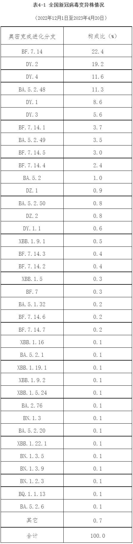 ?。ǘ?2月以來(lái)本土病例病毒變異株監(jiān)測(cè)情況。2022年12月1日至2023年4月20日,全國(guó)共報(bào)送32993例本土病例新冠病毒基因組有效序列,均為奧密克戎變異株,涵蓋117個(gè)進(jìn)化分支。主要流行株為BA.5.2及其亞分支(構(gòu)成比64.3%)和BF.7及其亞分支(構(gòu)成比33.0%)等。其中,BA.5.2及其亞分支包括DY.2(19.2%)、DY.4(11.6%)、BA.5.2.48(11.3%)、DY.1(8.6%)、DY.3(5.6%)和BA.5.2.49(3.5%)等;BF.7及其亞分支包括BF.7.14(22.4%)、BF.7.14.1(3.7%)、BF.7.14.5(3.0%)、BF.7.14.4(2.4%)、BF.7.14.3(0.4%)和BF.7.14.2(0.3%)等(表4-1)。共監(jiān)測(cè)到本土重點(diǎn)關(guān)注變異株603例,其中,4例BQ.1、4例BQ.1.1、19例BQ.1.1.13、1例BQ.1.1.17、1例BQ.1.1.18、1例BQ.1.1.35、1例BQ.1.1.38、1例BQ.1.1.46、1例BQ.1.1.53、2例BQ.1.1.66、1例BQ.1.1.69、8例BQ.1.2、1例BQ.1.23、2例BQ.1.8、2例CH.1.1、3例CH.1.1.1、1例CH.1.1.11、1例DT.2、1例EA.1、2例EG.1、3例EL.1、7例EM.1、1例EU.1.1、2例FB.1、3例FE.1、1例XBB、4例XBB.1、2例XBB.1.11.1、1例XBB.1.12、4例XBB.1.15、42例XBB.1.16、5例XBB.1.16.1、16例XBB.1.17.1、37例XBB.1.19.1、2例XBB.1.22、22例XBB.1.22.1、1例XBB.1.23、5例XBB.1.24、1例XBB.1.4、109例XBB.1.5、2例XBB.1.5.11、9例XBB.1.5.12、2例XBB.1.5.15、7例XBB.1.5.23、35例XBB.1.5.24、1例XBB.1.5.28、1例XBB.1.5.32、1例XBB.1.5.36、1例XBB.1.5.5、2例XBB.1.5.7、2例XBB.1.9、163例XBB.1.9.1、35例XBB.1.9.2、1例XBB.1.9.3、1例XBB.1.9.5、11例XBB.2.3、1例XBB.2.3.2、1例XBB.2.4和2例XBB.3。