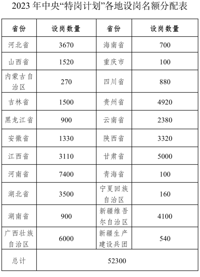 今年全國(guó)計(jì)劃招聘特崗教師52300名
