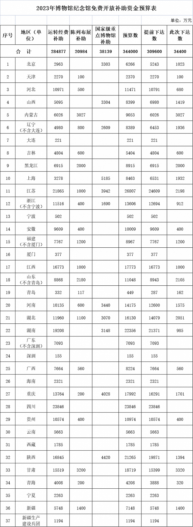 央視網(wǎng)消息:據(jù)財(cái)政部網(wǎng)站消息,根據(jù)《關(guān)于全國(guó)博物館、紀(jì)念館免費(fèi)開放的通知》(中宣發(fā)〔2008〕2號(hào))精神,財(cái)政部下達(dá)2023年博物館紀(jì)念館免費(fèi)開放補(bǔ)助資金(項(xiàng)目代碼:10000013Z135050000044,2023年政府收支分類科目:1100208結(jié)算補(bǔ)助收入)。數(shù)據(jù)顯示,全國(guó)預(yù)算344000萬元,提前下達(dá)309600萬元,此次下達(dá)34400萬元。