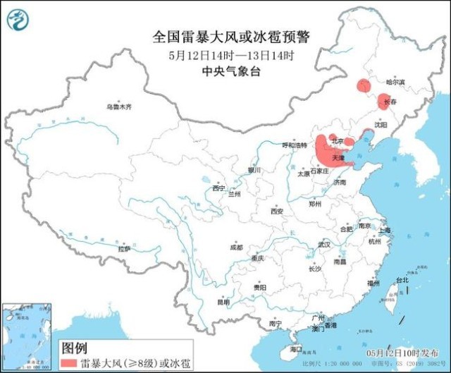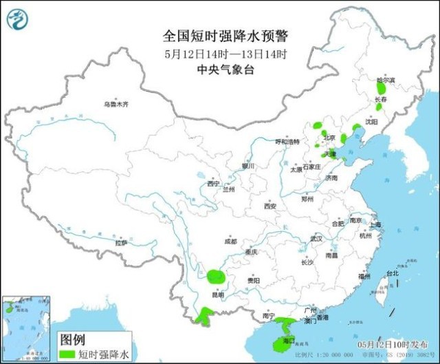 預(yù)計(jì)5月12日14時(shí)至13日14時(shí),河北中部和東北部、北京西北部和南部、天津南部、吉林中西部、遼寧西北部、山東北部等地的部分地區(qū)將有8-10級(jí)雷暴大風(fēng)或冰雹天氣;吉林中部、遼寧西部、河北中北部、北京西北部、天津南部、山東北部、四川南部、云南南部、廣西東南部、廣東西南部、海南島等地的部分地區(qū)將有短時(shí)強(qiáng)降水天氣,小時(shí)雨量20-40毫米,局地可達(dá)50毫米以上。