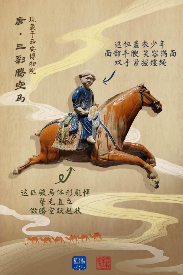 1000多年前,一位來自西域的“藍(lán)衣少年”,穿過茫茫戈壁、廣袤沙漠,抵達(dá)長(zhǎng)安。這位“藍(lán)衣少年”,是西安博物院“明星”藏品——唐代三彩騰空馬之上的騎手?!八?,也見證了這場(chǎng)跨越千年的文明交融。