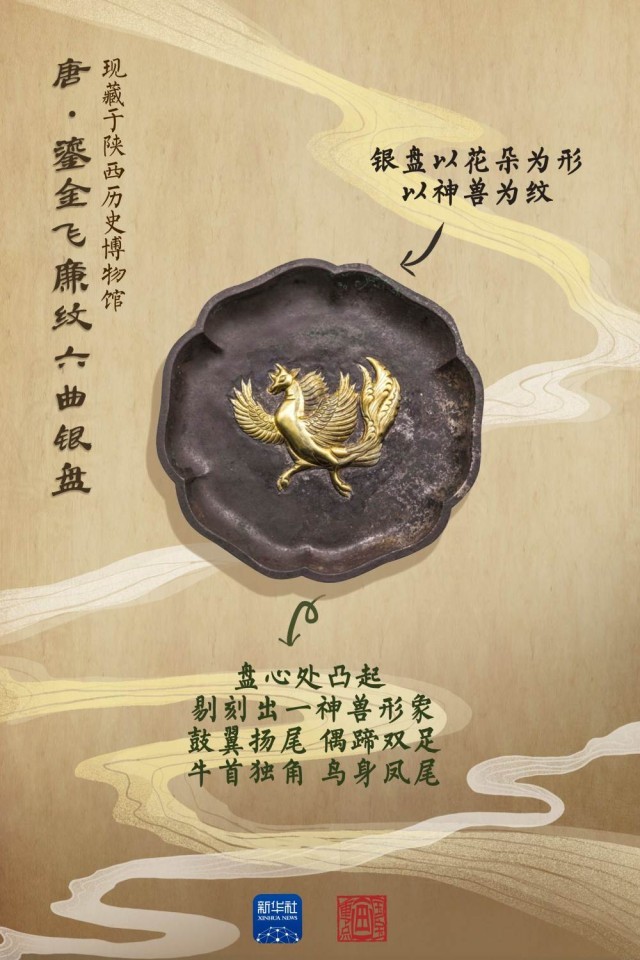 1970年10月,在西安市南郊何家村的工地上,施工人員偶然發(fā)現(xiàn)了一處文物窖藏,隨后在這里清理出千余件唐代珍寶。這件鎏金飛廉紋六曲銀盤制作考究、工藝典雅、紋飾獨(dú)特,盤心的神獸形象為飛廉,是中國(guó)古代神話傳說中的風(fēng)神。這件銀盤構(gòu)圖借鑒了中亞粟特的藝術(shù)手法,但題材卻是中國(guó)紋樣,反映出唐代工匠在借鑒西方金銀器藝術(shù)的基礎(chǔ)上,更加注重推陳出新。