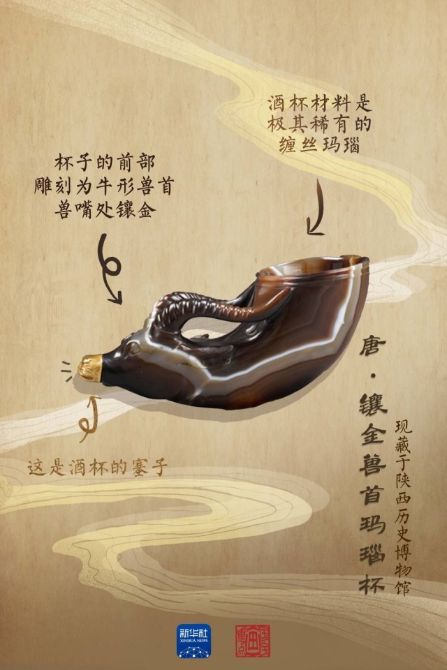 這件鑲金獸首瑪瑙杯,被列為我國(guó)禁止出境的珍貴文物之一。角狀杯體由一整塊極為罕見的紅色纏絲瑪瑙雕琢而成,整個(gè)杯體高6.5厘米,長(zhǎng)15.6厘米,口徑5.6厘米,其造型與起源于古希臘的酒具“來通”相似,“來通”曾廣泛流行于中亞、西亞地區(qū),沿著絲綢之路不斷東傳進(jìn)入中國(guó)。